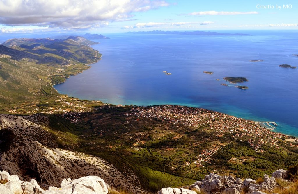 The starting point in the early morning is the cafe „Croccantino“not far from the ferry pier on the waterfront. First coffee and the tastiest croissant from Orebić, relax, look at the sea and finally check the equipment. Sturdy shoes, sufficient water, weatherproof clothing are required.Then it starts - a bit along the main street in the village ("Ulica Kralja Petra Krešimira") in a westerly direction to a small junction on the right to the Franciscan monastery „Gospe od Anđela“. Parallel to the road, follow the steep stony switchbacks until you are back on the road to the monastery.Above - distant view of the monastery from the waterfront.First glimpses into the distance along the southwestern coastline of the peninsula and at the starting point near the harbor open until you finally reach the monastery with the old captain's cemetery. Ornate tombs of the proud sailors invite you to linger in amazement. Many seafaring captains were once buried here. Already the view sweeps west over the "Pelješki Canal" towards the beauty of Korčula.Now the usual signs along the road lead you further uphill before turning into the wilderness on the west side of "Sveti Ilija". Further wonderful views of Korčula town and the horizon are offered. Below is the "zoomed view" of the old town of Korčula opposite, a few kilometers away. Shaped like a coat of arms or a shell, it lies there on a small peninsula and clings to the coast.The path continues uphill around the west side around the mountain and the vegetation changes from sometimes sparse to woody again. Numerous insects such as bees and many dragonflies greet you on the way up. Behind the island of Korčula, the island mountains opposite the canal reveal the silhouettes of the island of Lastovo, which is located southwest of Pelješac. Finally, after some time, the marked path runs long over easy and difficult passages through forest. With luck, some interesting encounters are waiting here.There are wild horses here, a relic from days past, starting with the Second World War, when the animals were left to their fate there. With a bit of luck and tranquility, other companions can also be identified in the rugged wilderness of the island karst. After some time and plenty of exertion, the forest begins to clear and meager vegetation and great views and distant views determine the landscape.Once there, a kind of stony plateau with crevasses and sharp pointed edges continues up to the summit of the island mountain, accompanied by further magical views. From a distance you can see the island of Vis exactly to the west and the island of Korčula to the south.Now the view of the east side of the city of Korčula in the center right and left in the picture Lumbarda - bottom left you can see the small port of Orebić.On the other side to the northwest are the island of Hvar, behind it Brač and on the right in the picture the mainland of the Dalmatian coast.On the side facing the mainland you can see the eastern tip of Hvar at the bottom of the picture, on which the Sućuraj lighthouse stands. Behind the mainland between Živogošće and DrvenikLooking to the southwest, the island of Mljet reveals itself and part of Orebić with a few tiny offshore islands at your feet.In the top left of the picture, the lighthouse "Korkyra" on the small island "Velika Sestrica" which you can also rent if you have the necessary change. To see again in the picture below.A majestic view from near the summit of Orebić and the coastline of the peninsula makes up for the hardships of the ascent. At the back of the picture is the Isel Mljet.Once you have reached the summit, you can enjoy the view and after a while of lingering and a little refreshment, you will return to Orebić, either on the route you have come or a descent on the south side through the forest. The descent route over the southern flank of Sveti Ilija leads to Orebić in the middle of the city.